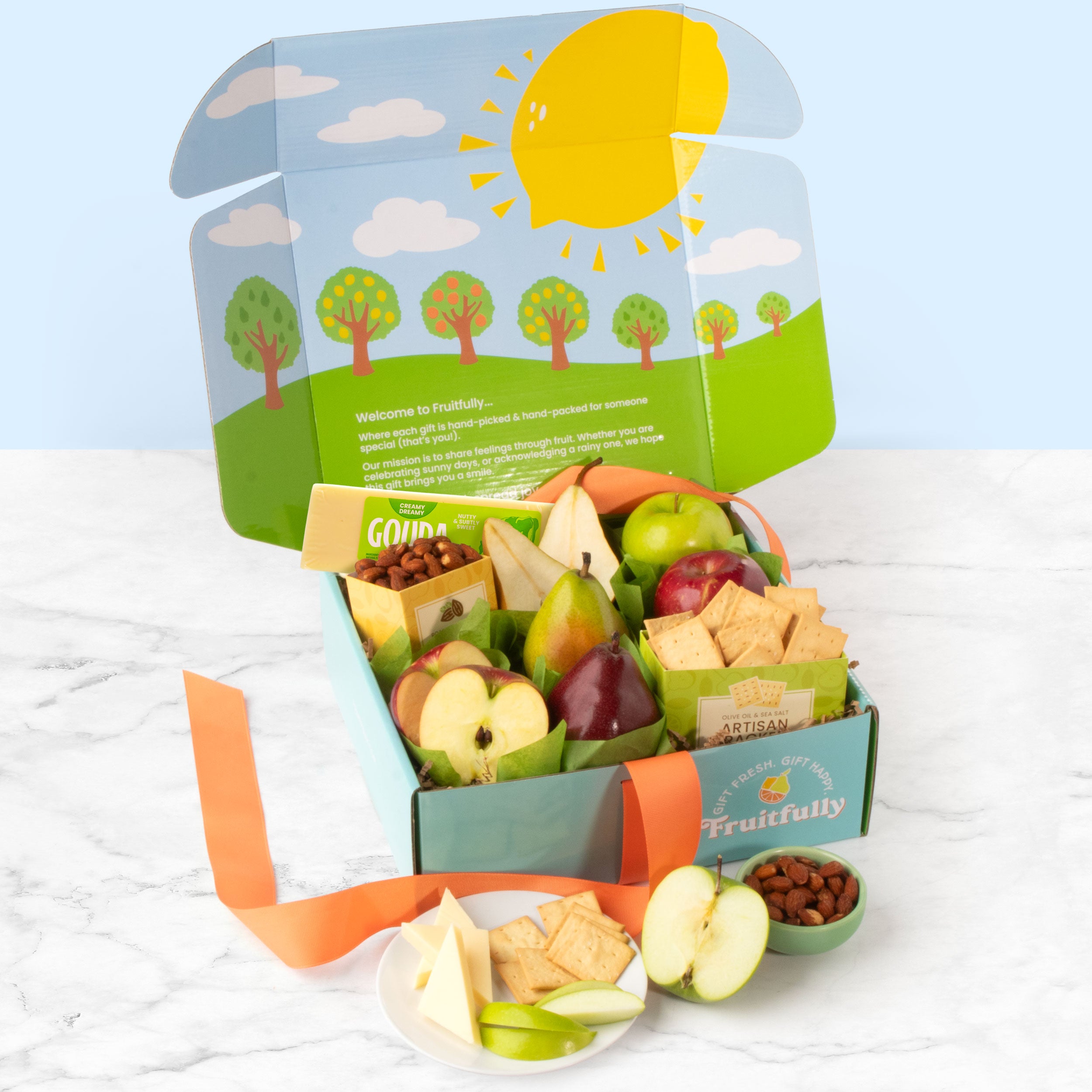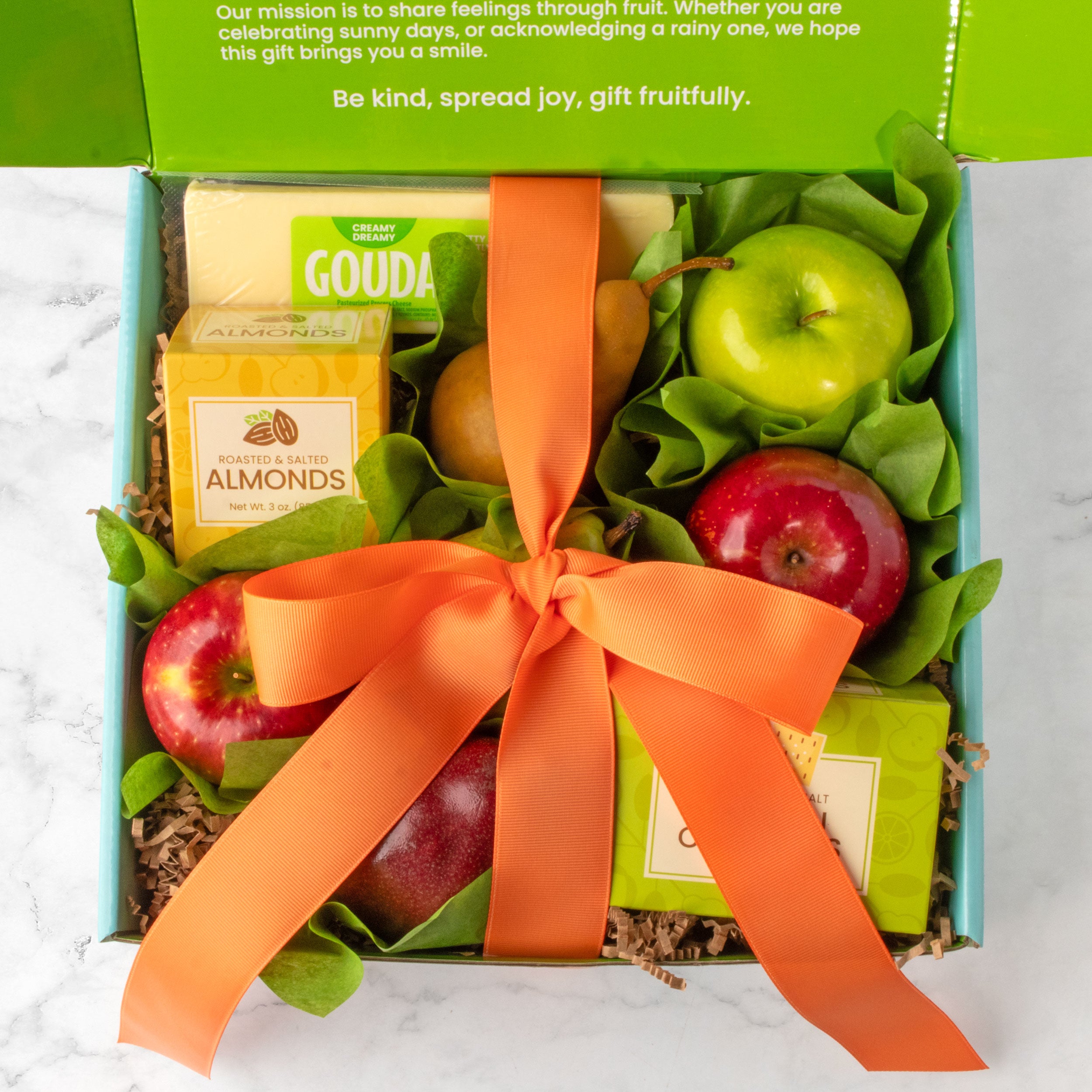 Fruit favorites and gourmet treats make a perfect gift for any occasion. This happy box of perfectly balanced pairings include healthy fruits, gouda cheese, crunchy almonds, and olive oil sea salt crackers. 5 lbs.
